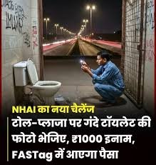 नेशनल हाइवे ऑथोरिटी ऑफ इंडिया ने टोल प्लाजा पर सफाई को बढ़ावा देने के लिए ‘स्पेशल कैंपेन 5.0’ शुरू किया है। इस स्कीम के तहत अगर किसी टोल प्लाजा का शौचालय गंदा मिले तो फोटो खींचकर शिकायत की जा सकती है। सही शिकायत मिलने पर फास्टैग में 1000 रुपये का इनाम दिया जाएगा।